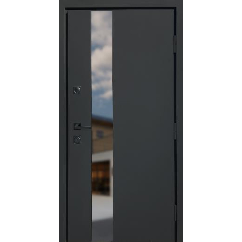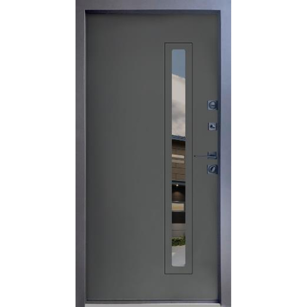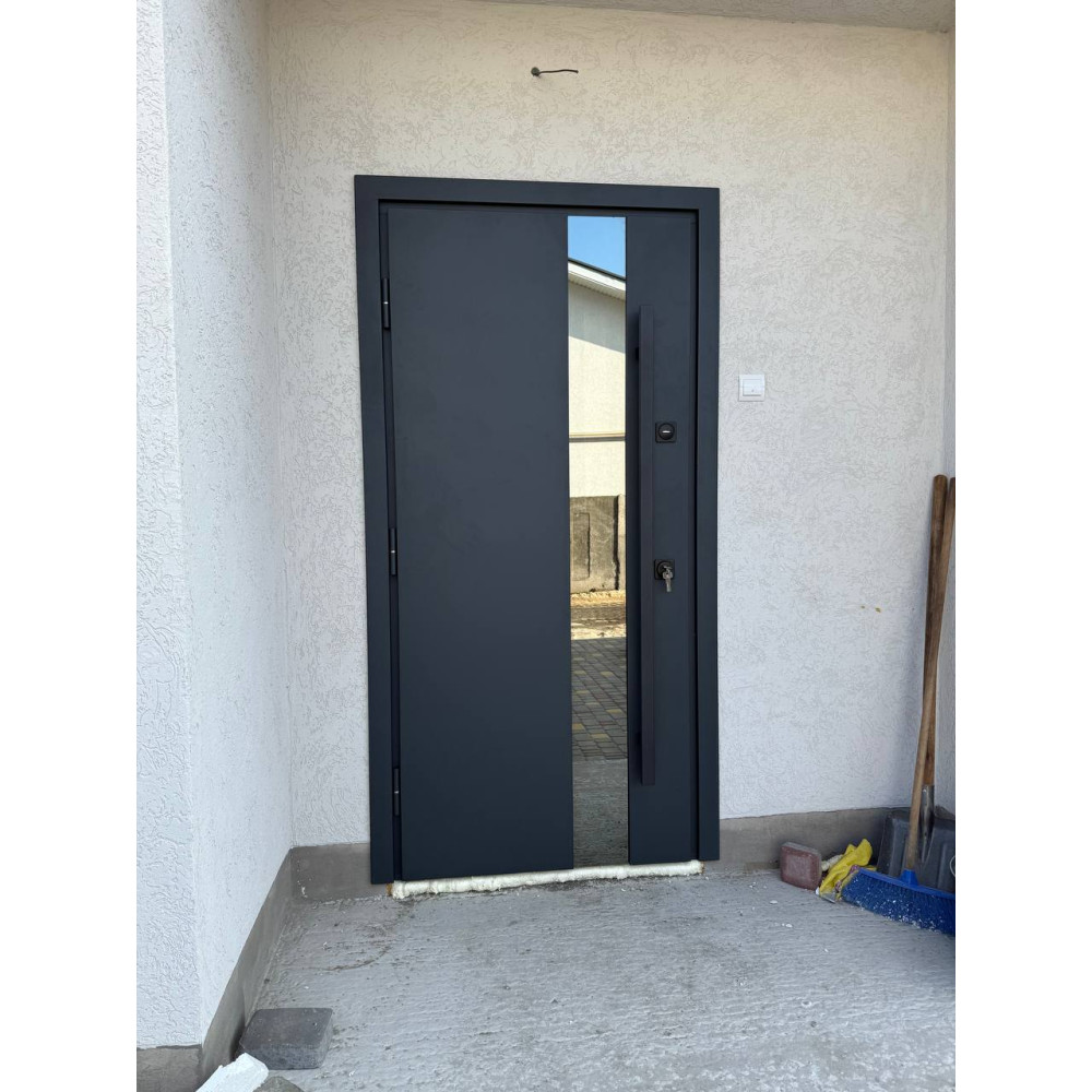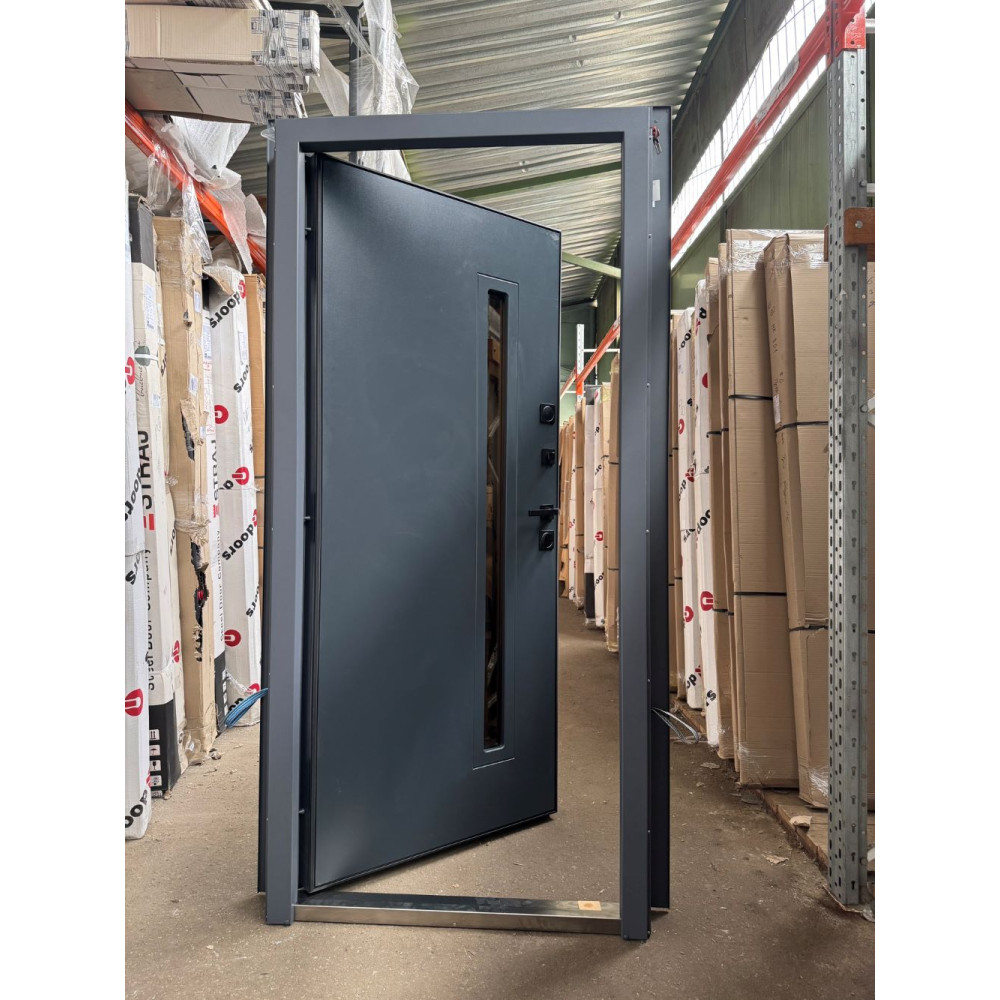 | Дверной короб | Гнутый профиль с ТЕРМО РАЗРЫВОМ, двойной притвор 125 мм, утепленный минеральной каменной ватой TERMOLIFE, p=115 кг/м.кв. ХРОМ ПОРОГ из нержавеющей стали. |